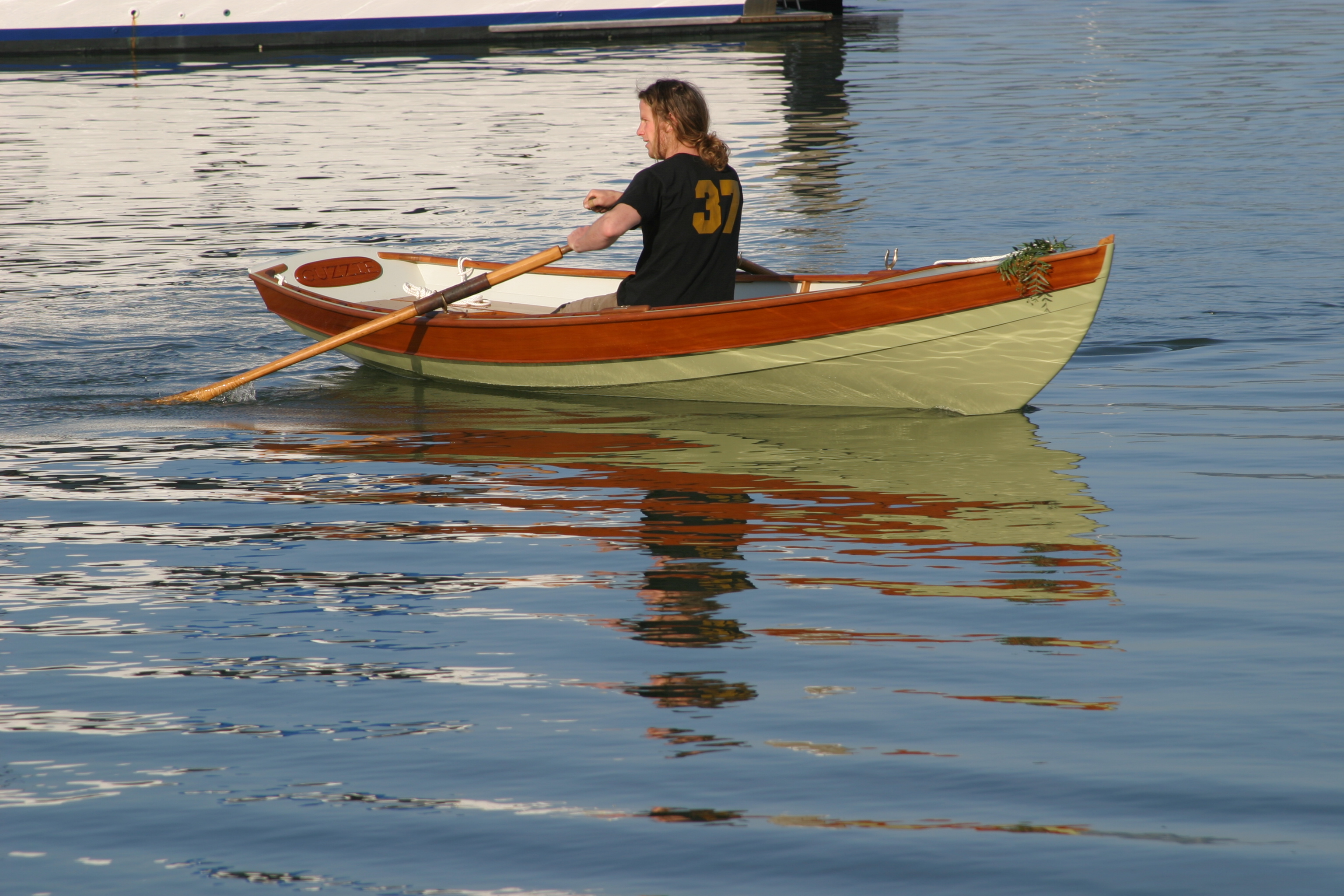 Based on William Chamberlain's Dory Skiff, the Guzzie Skiff is a light wieght 14 foot boat that can be built as a rowboat, or also rigged to sail. Weighing in at only 100 pounds, she's planked with 1/4" plywood to make her strong and light. It is a boat that I have tested in demanding conditions, rowing her off beaches all over Northern California to catch fish.